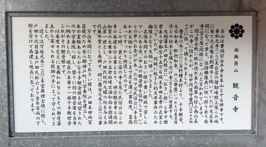 観音寺の中央石段を登ってすぐの所に観音寺の縁起を記した看板があります。
